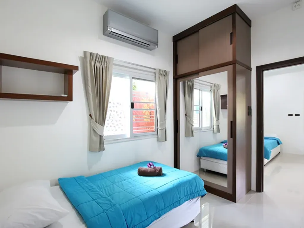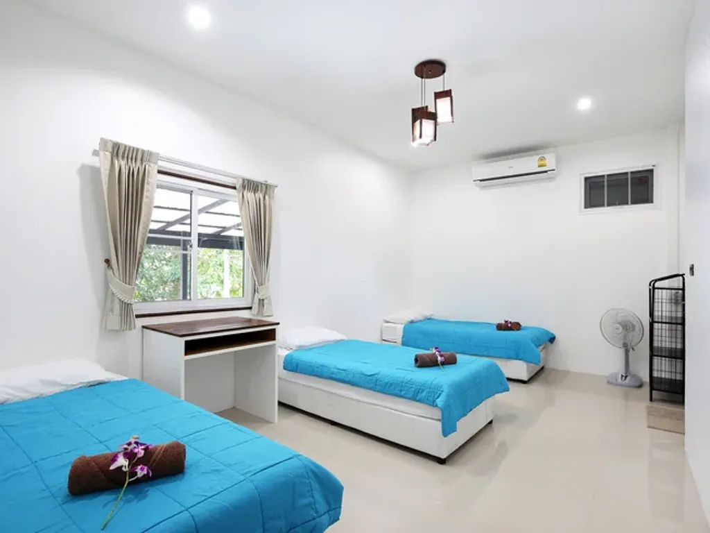 Shared accommodation for up to seven guests in three bedrooms (one private, two shared). Features air-conditioning, seven single beds, natural light, two modern bathrooms, and a fully equipped kitchen, providing a homely environment for retreat participants.