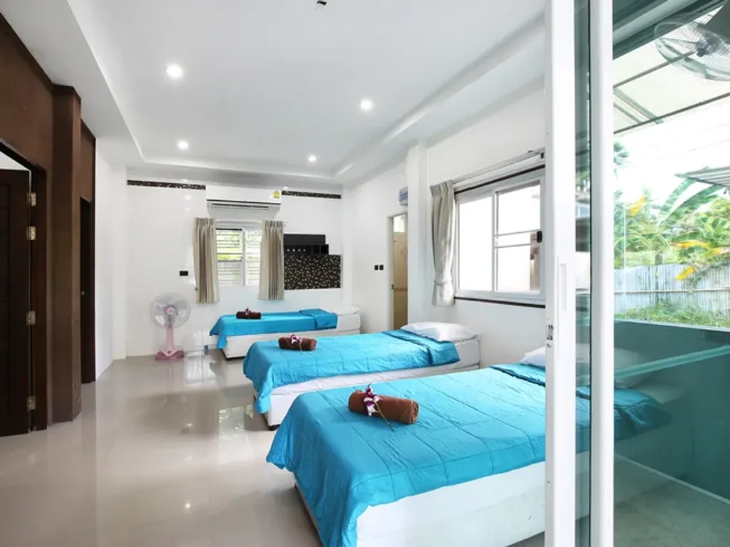 Shared or private wooden bungalows with options for single or double beds, featuring air-conditioning, an ensuite bathroom, and large windows showcasing tropical sea views, ideal for relaxation and study.