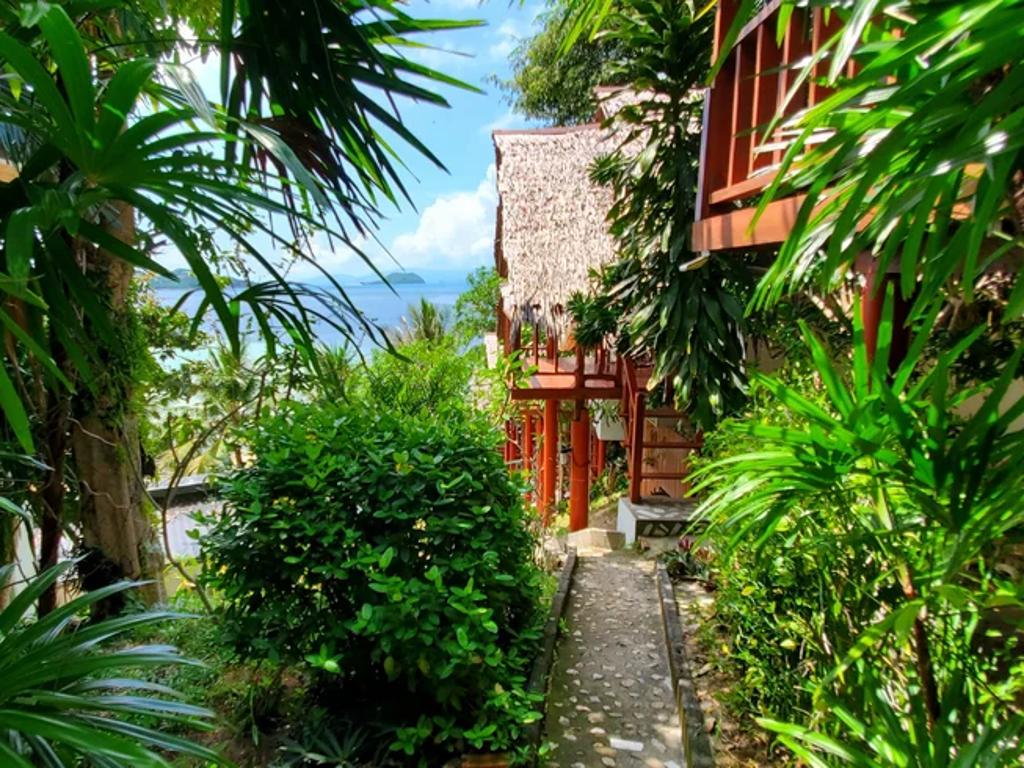Private bungalow surrounded by tropical greenery, featuring a double bed, air-conditioning, an ensuite bathroom, a spacious balcony, and modern amenities for a peaceful retreat.